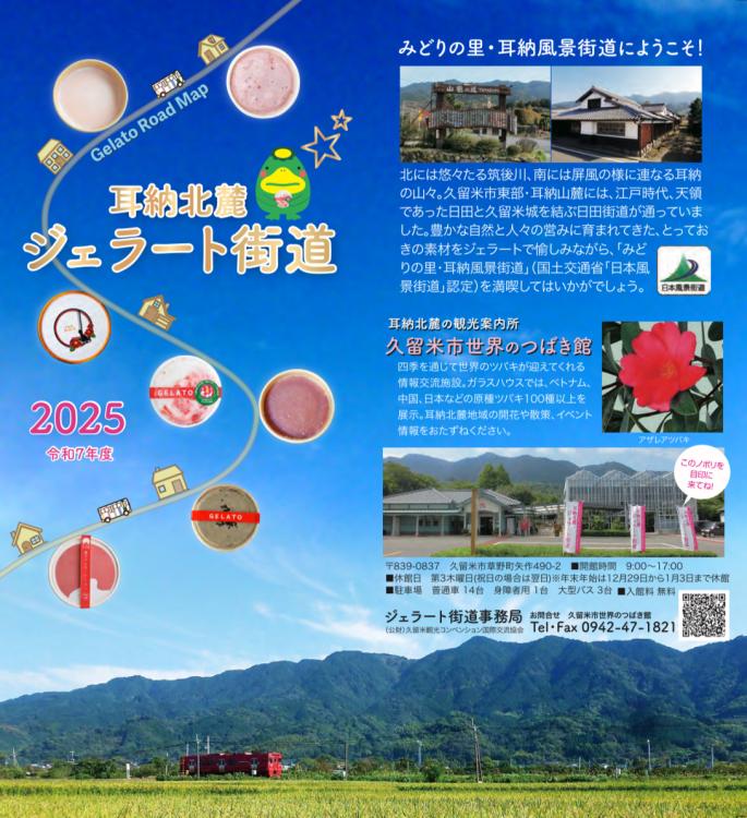 田主丸町の山苞の道から、草野町、山本町にかけての道は、別名「ジェラート街道」と呼ばれるほど名物ジェラートの宝庫。各店舗では地元の特産品を使った自慢のジェラートが楽しめます。