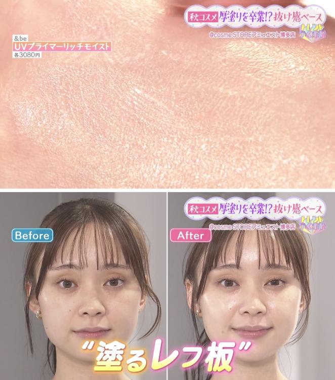 「水分量がすごいのがわかります。毛穴もぼかしてくれて、すごく肌が綺麗に見えます」と、池松美湖リポーターも大満足。