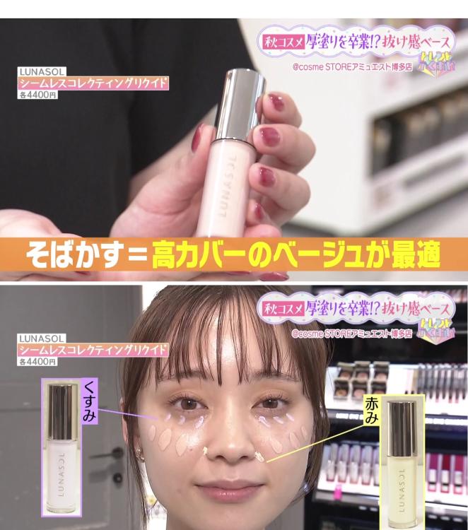 そばかすが気になるという池松リポーターに下村店長が提案したのが、「LUNASOL シームレスコレクティングリクイド」(各4400円)。
