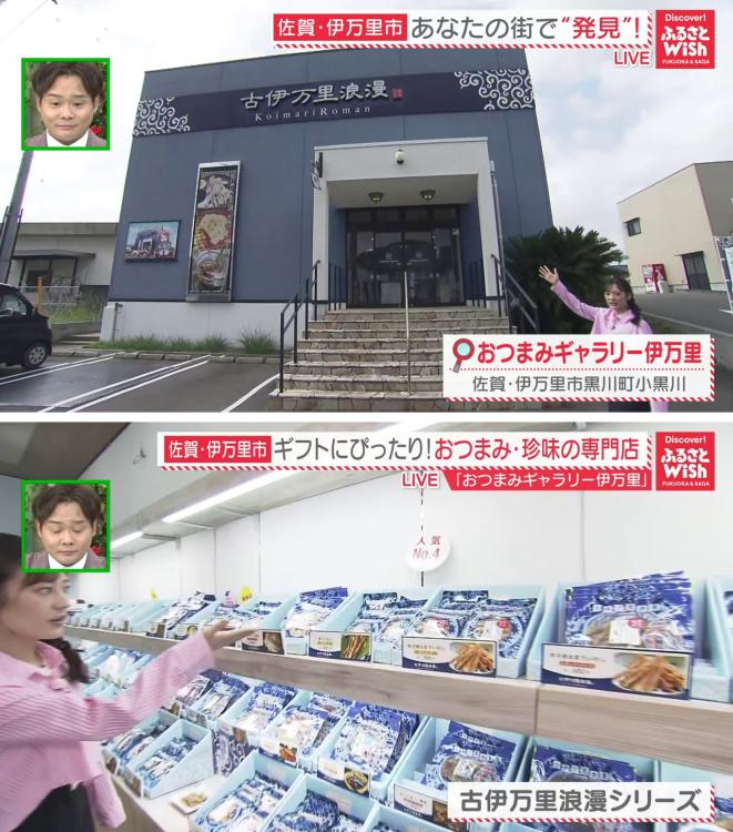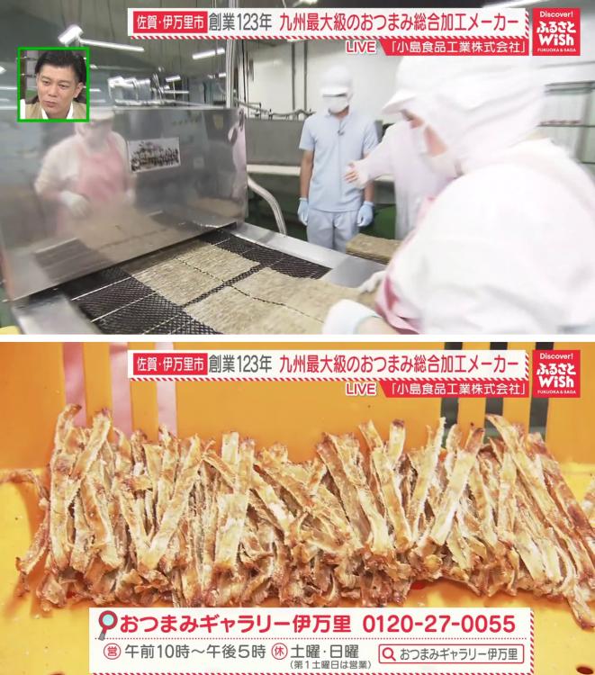 深川優月リポーターが訪れたのは、創業123年を誇る老舗おつまみ総合メーカー『小島食品工業株式会社』の直売所、『おつまみギャラリー伊万里』。