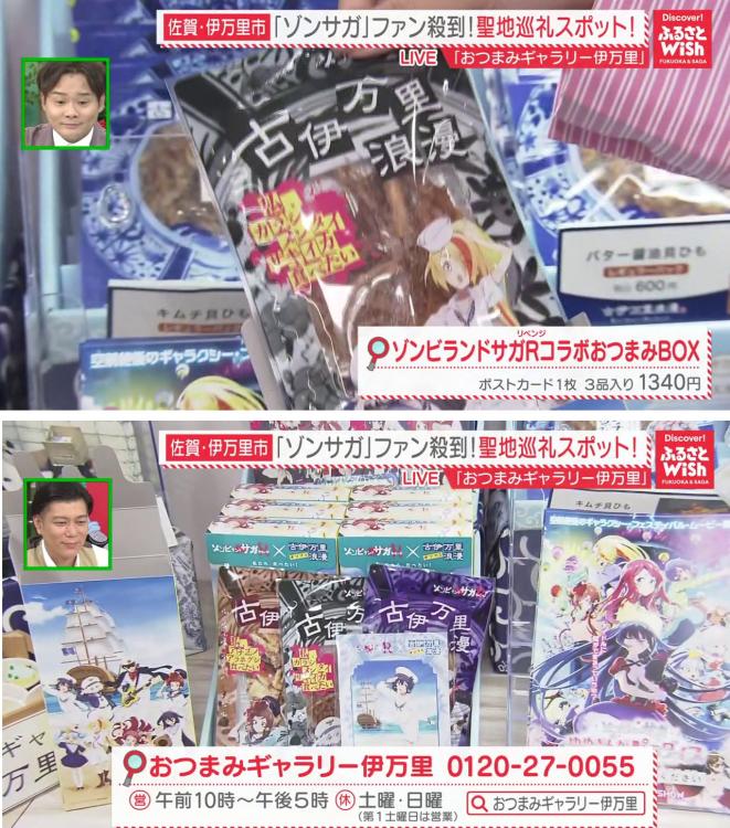 『おつまみギャラリー伊万里』は、佐賀県が舞台の人気アニメ「ゾンビランドサガ」のファンが全国から訪れる“聖地”としても知られています。作中でキャラクターが同社の工場でアルバイトをしていたという設定から、店内にはコラボ商品やファンのための交流スペースが設けられています。
