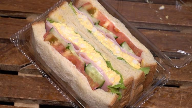 野菜、ハム、手作りタマゴサラダを挟んだ定番サンドイッチ。