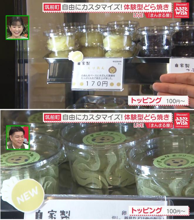 井上桃子リポーターは、ノーマル生地とスフレ生地を3枚重ね、くりあん、まっちゃクリーム、チョコレートクリームを贅沢にサンドしたオリジナルどら焼きを創作。井上リポーターも「合う合う!すごくおいしいです」と、和と洋の意外な組み合わせに驚いた様子でした。