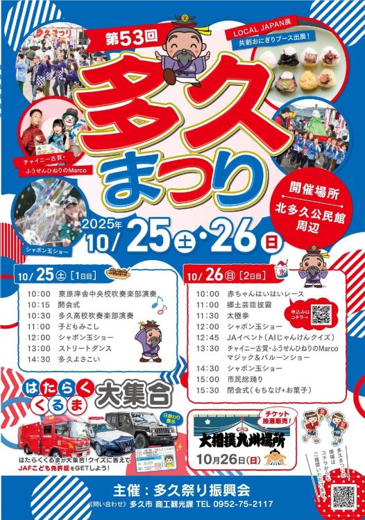 今年も佐賀県多久市の秋の風物詩『多久まつり』の季節がやってきました!開催は10月25日(土)と26日(日)の2日間。熱気あふれるステージイベントはもちろん、今年の目玉は、なんと大阪・関西万博に出展して話題になった「共創おにぎり」のブース!そして子どもたちの五感を刺激するおもちゃ美術館「木育キャラバン」も同時開催されます‼