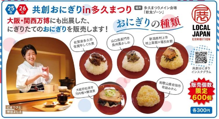 さらに、今年の多久まつりで見逃せないのが「共創おにぎり」ブース!多久市の「佐賀牛しぐれ煮おにぎり」をはじめ、大阪・関西万博のLOCAL JAPAN展で大好評を博した全国5市のアイデアが詰まったおにぎりが、なんと「にぎりたて」で味わえます(1日限定300個)。この機会に万博の絶品グルメを堪能してくださいね。