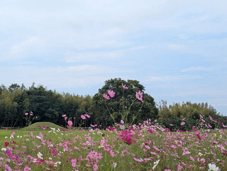約10万本のコスモスが咲き誇り、芝生広場や遺跡とのコントラストも◎。見ごろは今から10月下旬ごろまでの予定。