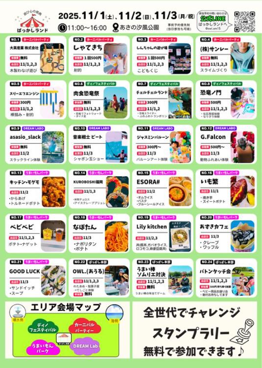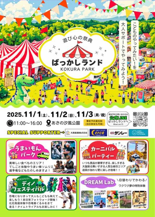 北九州市小倉北区のあさの汐風公園で、11月1日(土)から3日(月・祝)の3日間、「全世代全力遊びチャレンジ」をテーマにした体験型フェス『第1回ばっかしランド in.こくら』が開催されます。