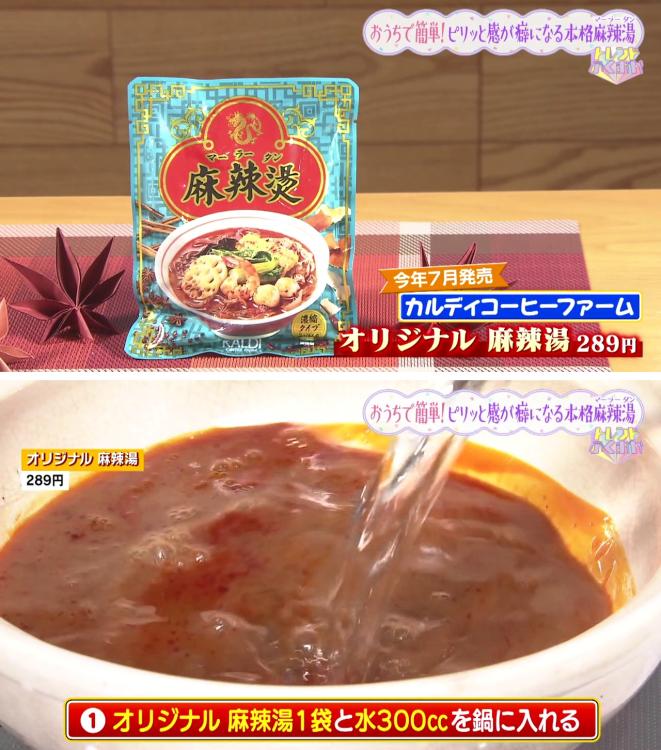 今年7月に発売された「オリジナル 麻辣湯」(289円)は、作り方はとっても簡単! 鍋に「麻辣湯」1袋と水300ccを入れ、お好みの具材を入れて約8分煮込むだけ。 おすすめ具材は、カルディで買える「平太春雨」(375円)だそうです。