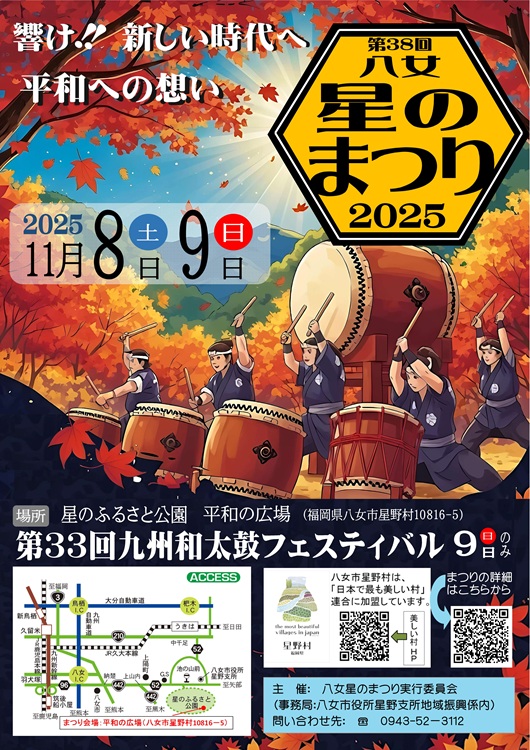 福岡県八女市の星野村で開催される秋の風物詩。 9日には、九州各県の著名な太鼓団体が一堂に会する『第33回九州和太鼓フェスティバル』を開催。