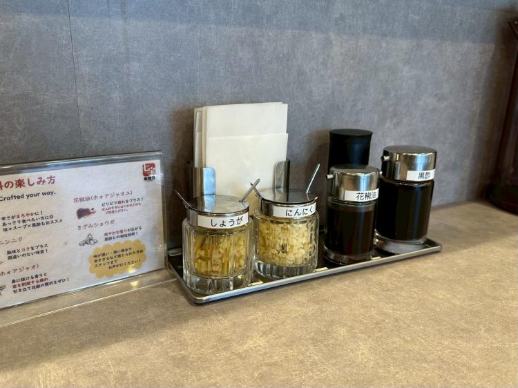 テーブルには、黒酢・花椒油・にんにく・しょうがなどの調味料がずらり。