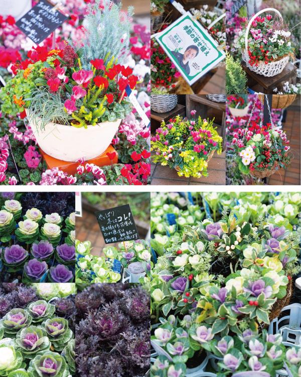 「花苗ごとに実際どんな楽しみ方ができるか、お客様にイメージしていただけるように、各コーナーごとに寄せ植えを展示販売しています。この時期、寄せ植えにおすすめなのが、シクラメンとハボタンです。鉢植え、ハンギング、リースなどどのタイプの寄せ植えにも使いやすいのと、花や葉の形や色の組み合わせによって個性が出しやすいのが特徴です」と橋口さん。
