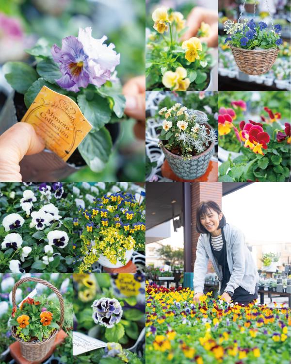 橋口さんのお気に入りは有名生産者・見元さんのシリーズ(写真左上)や和風テイストの優しい色合いが特徴の万葉菫(まんようすみれ)シリーズ(写真中上の黄色の花)。数ある中から、自分だけのお気に入りを見つける楽しみ方ができるのも、パンジー・ビオラの魅力のひとつです。