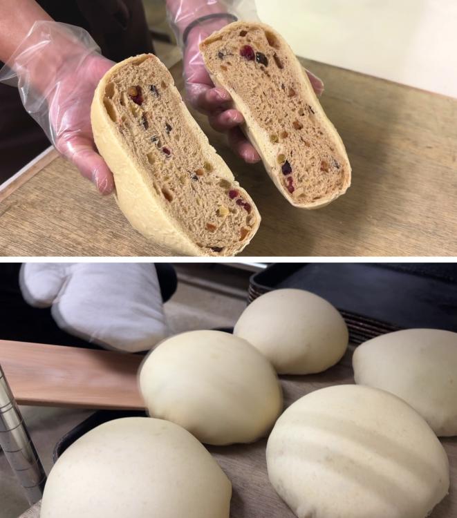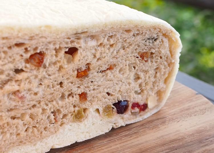 ラム酒漬けにした7種類のドライフルーツを使用し、外側と内側で異なる生地を使うことで、独特の食感が生み出しています。