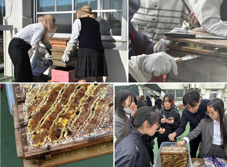 この日のために「NPO法人 博多ミツバチプロジェクト」と一緒に、生徒が学校の屋上で希少なニホンミツバチの育成に挑戦!