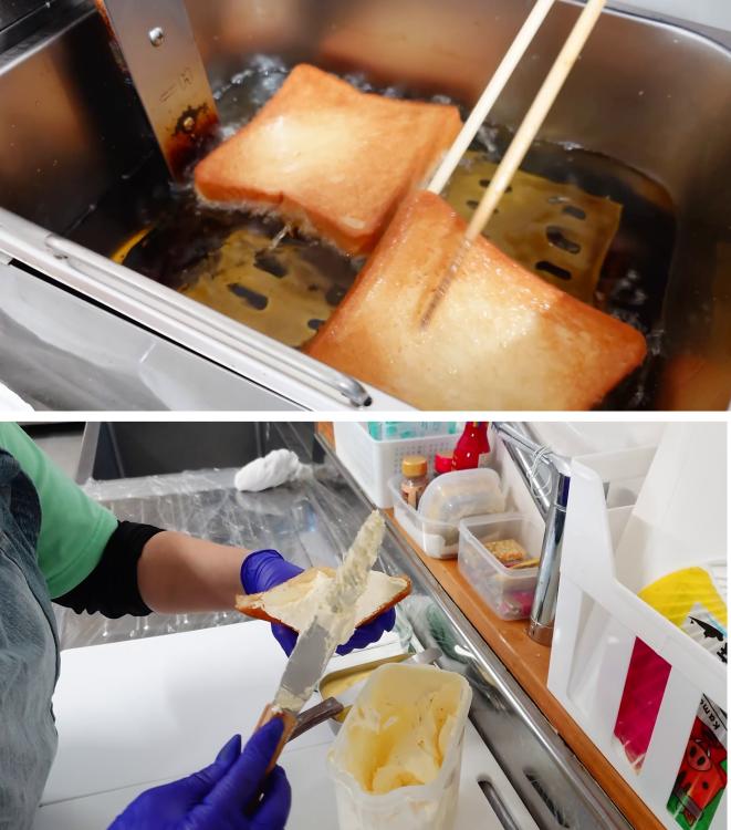 名物の「揚げサンド」に使用するのは、あえてキメを粗く仕上げたパン。 揚げた時に余分な油が抜けやすく、外はサクッ、中はふんわりとした軽い食感に仕上がります。