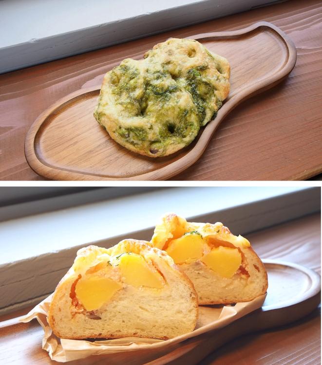 五島から取り寄せた「生あおさ」と枝豆を練り込んだフォカッチャ。