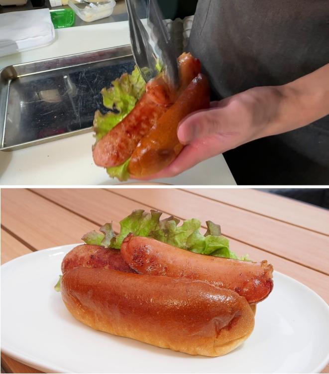 ポークソーセージを縦半分にカットして焼くことで、香ばしさとスパイシーさを引き立てています。
