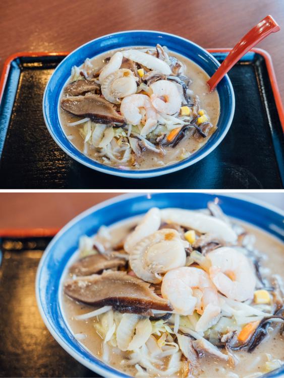 エビ、イカ、ホタテといった海鮮がたっぷり入り、さらに甘く煮た椎茸が絶妙なアクセントになっている。椎茸から出る優しい甘みが、豚骨スープと溶け合い、まろやかで奥深い味わいを生み出す。