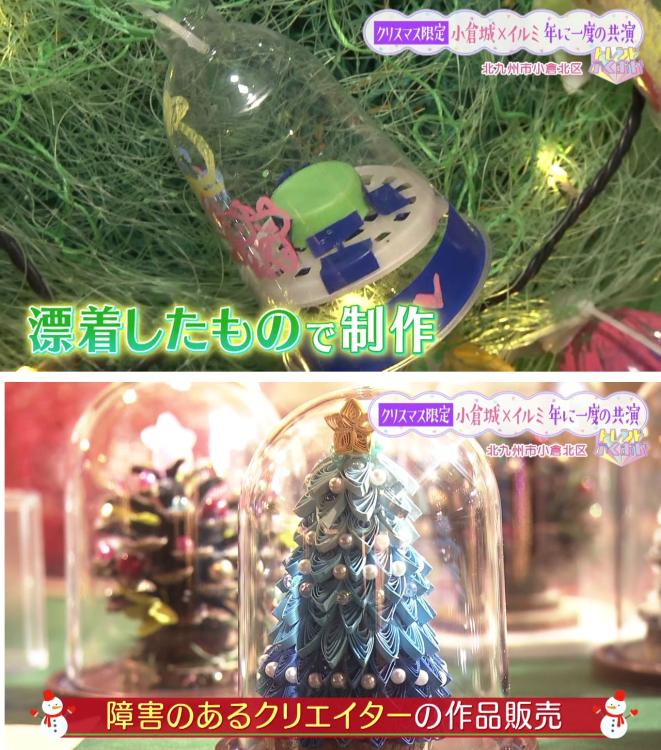 地域のみんなで新しい価値を創り出す取り組みが行われています。 その一つが、海岸に流れ着いた漂着ゴミで作られたアート作品。 よく見るとプラスチックゴミなどが混ざっていて、環境問題について考えるきっかけにもなりますね。 他にも、紫川の清掃で集めたものを使ったクリスマスリースなど、SDGsな作品が展示・販売されています。
