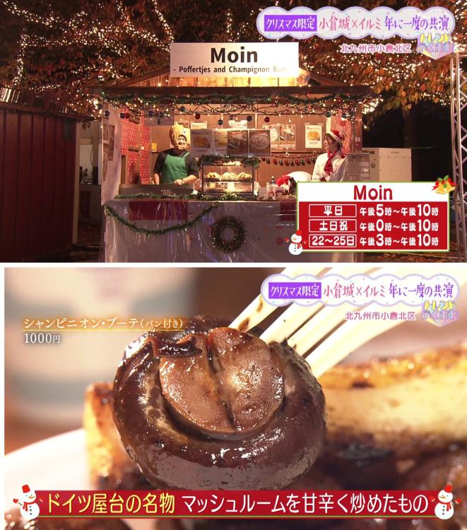 クリスマスマーケットといえば、おいしいグルメも欠かせません! ドイツからの留学生や地元の学生が運営する屋台「Moin(モイン)」では、本場ドイツの味が楽しめます。 まつおはるかリポーターがいただいたのは、マッシュルームを甘辛く炒めたドイツ屋台の名物料理「シャンピニオン・プーテ(パン付き)」(1000円)。 「マッシュルームのプリプリ食感とソースの香ばしさが最高」と絶賛です。