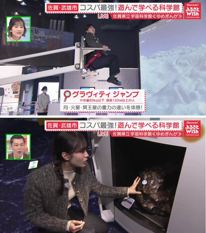 そして、去年(2024年)3月にリニューアルした「宇宙発見ゾーン」へ。ここでは、宇宙を身近に感じる体験ができ、宇宙飛行士になった気分で遊ぶことができます。中でも大人気なのが、「グラビティジャンプ」という装置。これに座ると、地球以外の月、火星、冥王星の重力を体験できます。月面では地球の6分の1の重力となり、大久保美咲リポーターも「すごい!私ってこんなに軽かったっけ!」と大ジャンプをしながら不思議な気分に。他にも、宇宙服のレプリカや、隕石に触れることができる展示など、大人も子どもも夢中になれる空間です。