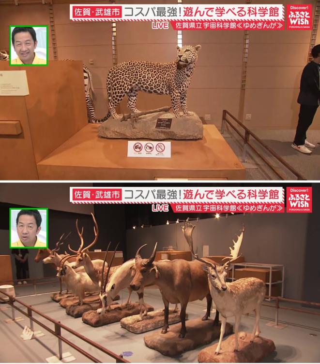 「佐賀発見ゾーン」では、佐賀に生息する動物たちが展示されています。特に目を引くのは、水槽に展示された大きな魚の標本。これは佐賀県の唐津市で水揚げされた「リュウグウノツカイ」のはく製です。さらに、「アナグマ」や「タヌキ」など佐賀にゆかりのある動物のはく製も並んでいます。