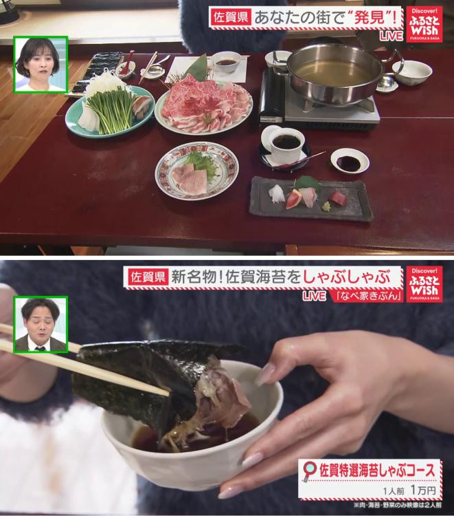 テーブルには「A5ランクの佐賀牛ロース」や「金星佐賀豚ロース」など、見事な霜降りのお肉が並びます。 今回いただく新名物は、その名も「佐賀海苔しゃぶしゃぶ」。 ご飯に巻くのではなく、なんとお鍋で楽しむスタイルです。 代表取締役の下村光一郎さんが提案するのは、驚きの4段階の食べ方。