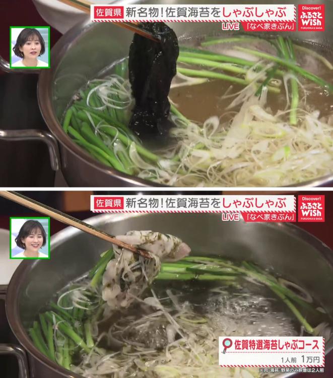 そして3つ目は、お鍋の中に海苔を溶かして、豚肉に絡めて食べるスタイル。 お出汁に溶け出した海苔が、旨味の強い豚肉にしっかりと絡みつきます。 「豚肉と海苔、合います!熱々なのがまたおいしい」 お肉の旨味と海苔の風味が一体となり、お箸が止まりません。