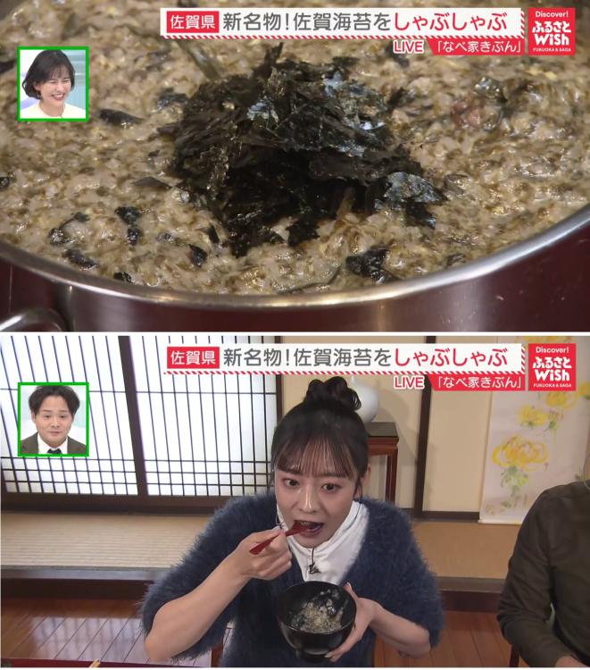 まずは1つ目、たっぷりの白髪ネギと佐賀牛をお出汁にくぐらせ、生の佐賀海苔で巻いてパクリ! 「佐賀牛の脂がジュワッと広がるんですが、海苔のパリパリ感が良いアクセントになって全然脂っこくない!」 と、深川優月リポーターも1口目から驚きを隠せません。