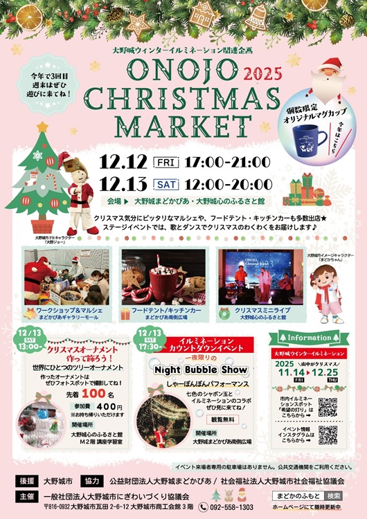 クリスマスが近づく12月12日(金)と13日(土)の2日間、福岡県大野城市に『ONOJO CHRISTMAS MARKET2025(大野城クリスマスマーケッ2025)』が登場。大野城まどかぴあ一帯が、温かい光とおいしいものでいっぱいの特別な空間に変身します!