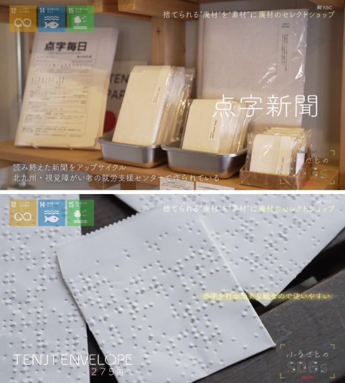 他にも、北九州市にある視覚障がい者の就労支援センターで作られ、役目を終えた「点字新聞」は、その独特な手触りとデザイン性からラッピング素材として人気です。「TENJI ENVELOPE」(275円~)
