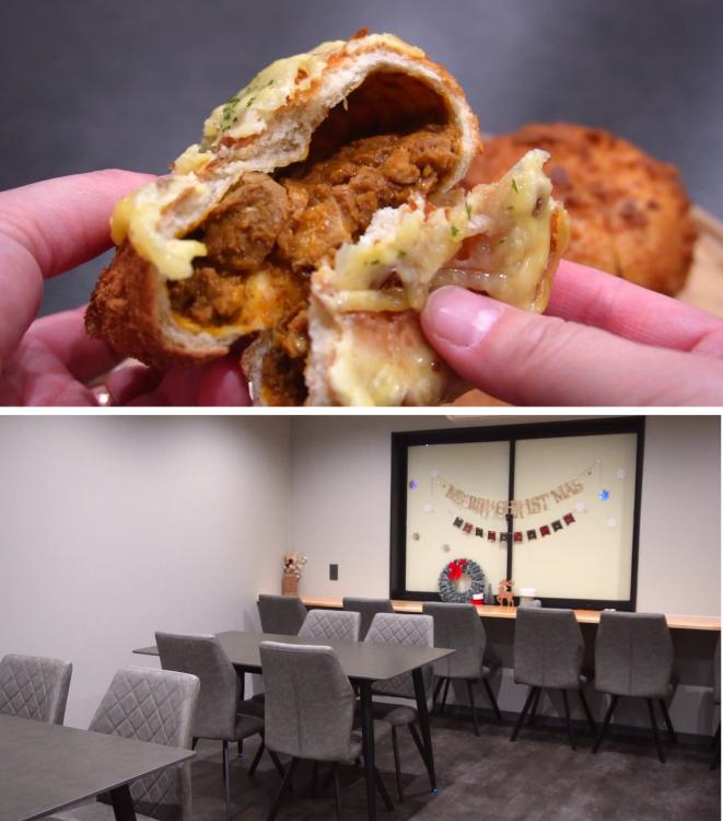 その他、とろ~りチーズが食欲をそそる『バターチキンチーズ焼きカレーパン』(189円)など、食事系パンもオススメ。店内にはイートインスペースもあります!