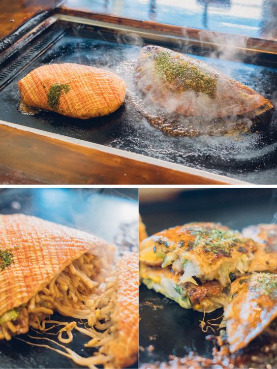 鉄板の上で焼き上げられたお好み焼きは、関西風でもなく、広島風でもない。生地で具材をはさんだ独特のフォルムだ。