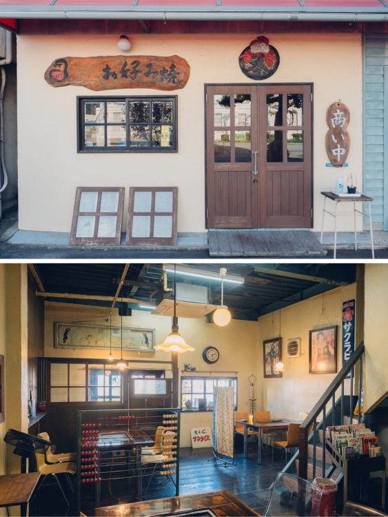 レトロ雑貨に囲まれた空間。戦後から続く大牟田のお好み焼きの味。子どもたちが初めての外食で訪れる場所。