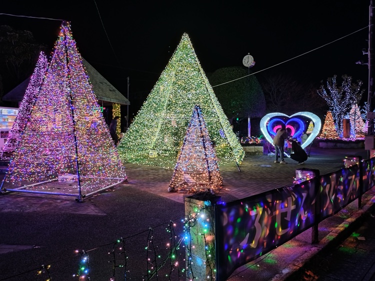 駅横の「電車が見える公園」がメイン会場。木々や広場が色とりどりのLEDで飾られ、SNS映えするオブジェも登場。昼間とは全く違う、ロマンチックな雰囲気に包まれます。