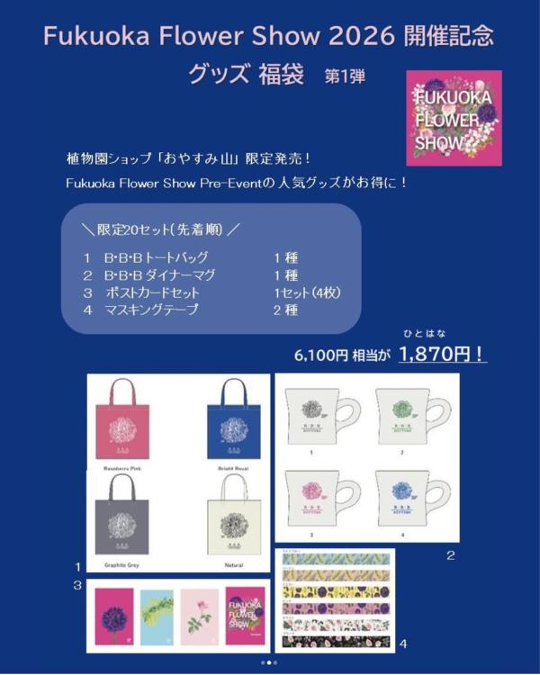 福岡市植物園ショップ『おやすみ山』では、『Fukuoka Flower Show 2026』の開催を記念して、『Fukuoka Flower Show Pre-Event』の人気グッズを集めたお得な福袋を販売中!