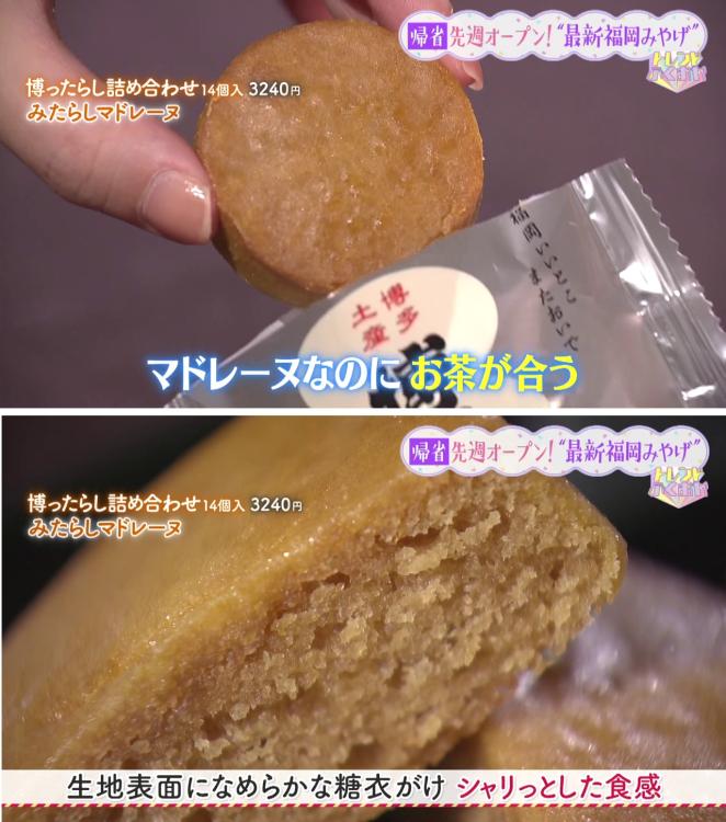 おみやげとして受け取った宮本啓丞アナウンサーも「かなり“みたらし”てます!」と驚くほど、しっかりとした醤油の風味が特徴です。表面はなめらかな糖衣でシャリっとした食感。中はしっとり。 マドレーヌなのに日本茶にも合う、これまでにない新しいおいしさです。