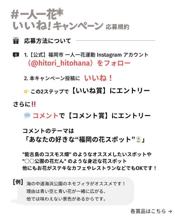 「福岡市一人一花運動」の公式インスタグラム・アカウントをフォローして、キャンペーンの投稿記事に、あなたの好きな“福岡の花スポット”をコメントすると、「コメント賞」に応募することができます。