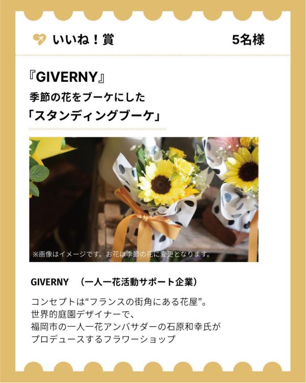「いいね!賞」では、一人一花活動サポート企業である『GIVERNY(ジベルニー)』の季節の花がギュッと詰まった「スタンディングブーケ」が5名に当たります。