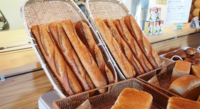 筑前町産の米を使った米粉を使用しており、季節やその日の粉の状態に合わせて水分量を調整。"かご"に入れて発酵させることから名づけられた「かごパン」が看板メニューです。