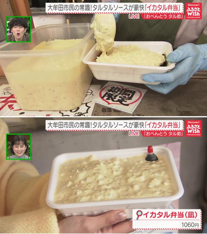 大牟田のソウルフードといえば「イカタル弁当」。ご飯の上にのりを敷き、イカゲソの揚げ物をのせて、その上から特製のタルタルソースをたっぷりかけた豪快弁当です。