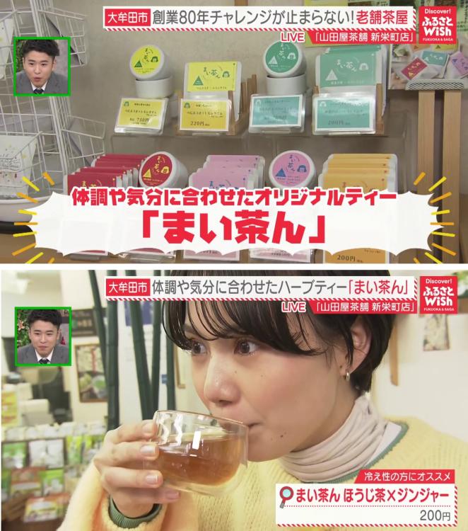 山田店長が開発したのは、日本茶とハーブを掛け合わせたオリジナルティー「まい茶ん」(200円~)。「ママや妊婦さん、お子さんも安心して飲めるお茶を作りたい」という、保育士時代の経験を活かした優しさが詰まっています。 冷え性の方におすすめの「ほうじ茶×ジンジャー」をいただいた瀧リポーターは、「鼻に抜ける生姜の香りが最高!すごく合います」と心も体も温まった様子でした。