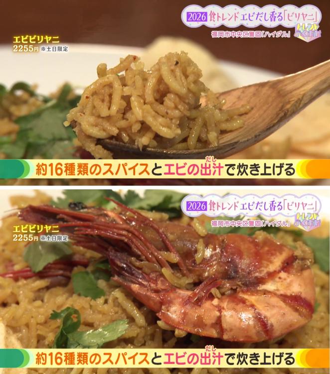試食したリポーター・はじめちゃんは、「口に入れた瞬間、お米がパラパラと解けて香りが鼻へ抜ける!」と初めて食べた「ビリヤニ」に感動!後から追いかけてくるエビの濃厚な旨味と香りがたまりません。
