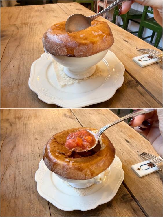 こんがり焼かれたパンをそっと崩すと、中からは野菜がごろごろ入ったボルシチスープ。