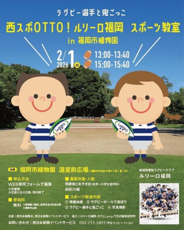 福岡市植物園の温室前広場にて、福岡に本拠地を置くラグビーチーム『ルリーロ福岡』の選手と一緒に、体を動かして遊ぶスポーツ教室を開催。