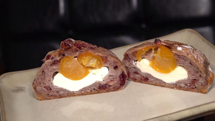 カンパーニュの生地に、クランベリーとくるみを練り込んだ冬の人気メニュー。中には、自家製コンポートの金柑とクリームチーズが包まれています。金柑のジューシーな甘みとチーズのコクが相性抜群です。