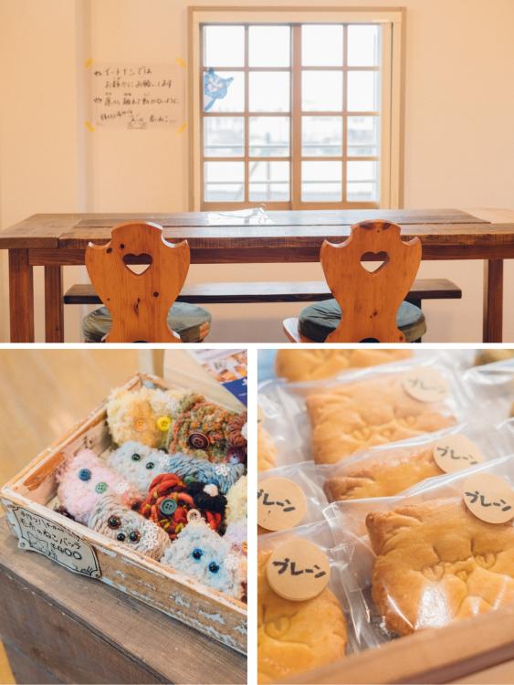 店内で販売されている手編みのねこのバッジや雑貨の一部は、利用者さんたちが作ったもの。商品の値札シール貼りや近隣への配達も、彼らの大切な仕事です。