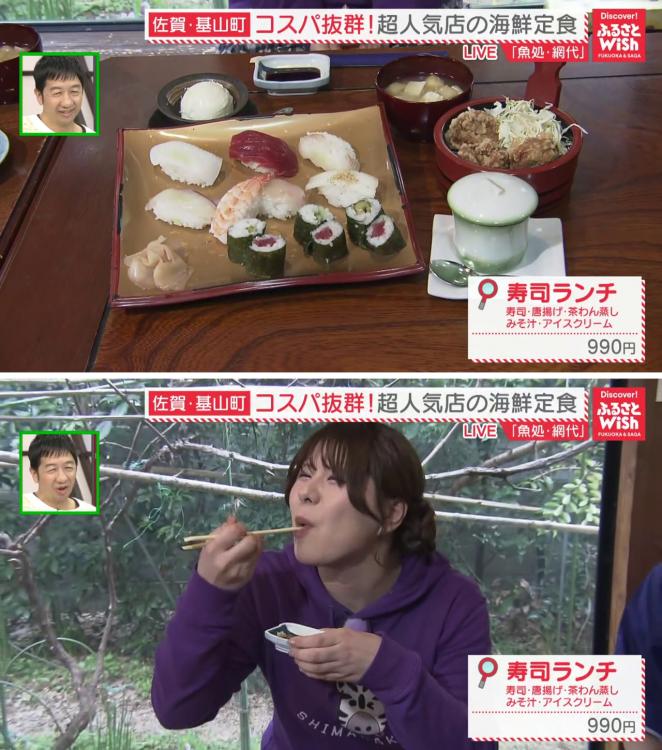 「寿司ランチ」(990円)は、職人が握る本格的なお寿司に、お店自慢の唐揚げ、茶わん蒸し、みそ汁、さらにアイスクリームまで付いた超お得なセットです。ヒラメのお寿司を頬張った大川リポーターは「身がプリップリです」と大絶賛。セットの唐揚げも「ジューシーで最高!」と、サイドメニューのクオリティーの高さにも驚かされました。