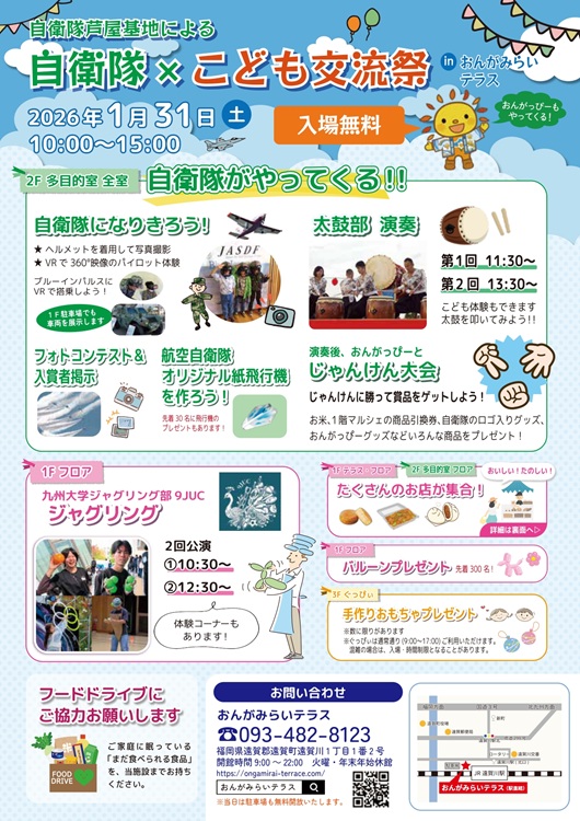 JR遠賀川駅のすぐ目の前、おんがみらいテラス(福岡・遠賀町)で、『自衛隊×こども交流祭』が開催されます。私たちの暮らしを守るお仕事の裏側を、遊び感覚でちょっとのぞいてみませんか?