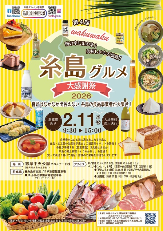 糸島好きのみなさん、カレンダーの2月11日(水・祝)に大きな丸をつけてください!今年も志摩中央公園で、糸島のおいしい味覚がギュッと集まる『第4回 糸島グルメ大感謝祭2026』が開催されます。地元の食品メーカーなど29のブースが並び、この日だけの特別価格で自慢の品を大放出する、まさに食の祭典。工場直売ならではのお得な商品がめじろ押しで、毎年朝から行列ができる人気イベントです!